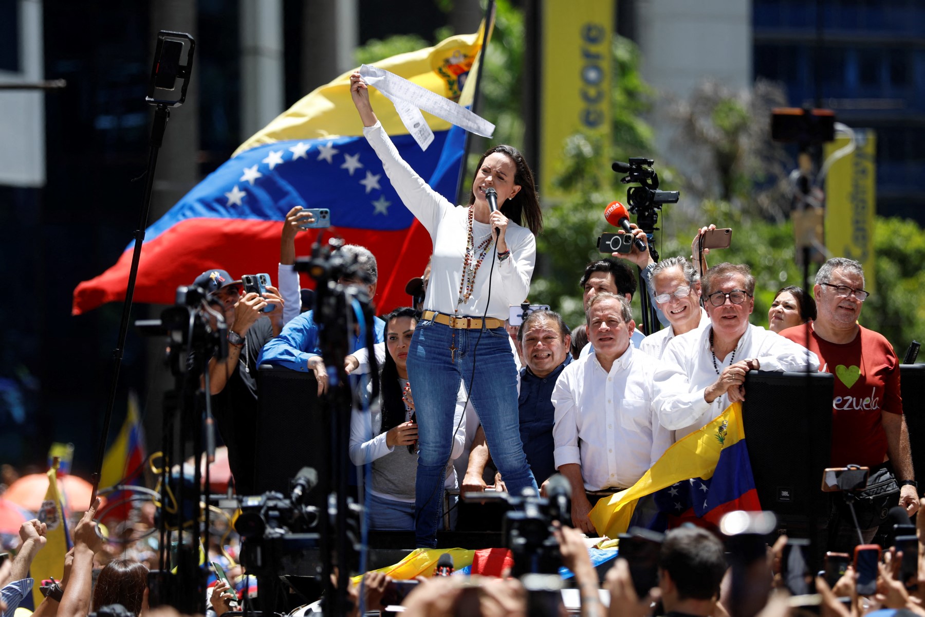 La líder opositora venezolana María Corina Machado se dirige a sus simpatizantes mientras sostiene actas electorales durante una manifestación en Caracas, el 28 de agosto de 2024. Foto: AFP.