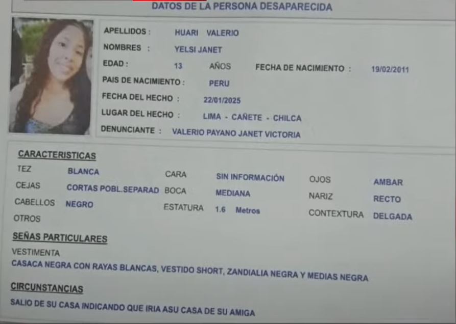 Una menor de 13 años, identificada como Yelsi Janet Huari Valerio, se encuentra desaparecida desde el pasado miércoles por la tarde. La adolescente había abordado un colectivo informal en Chilca con destino a Lima, donde planeaba reunirse con familiares en la zona de La Victoria, cerca del cruce de las avenidas 28 de Julio y Riva Agüero. Sin embargo, nunca llegó a su destino y desde entonces no se ha tenido contacto directo con ella.