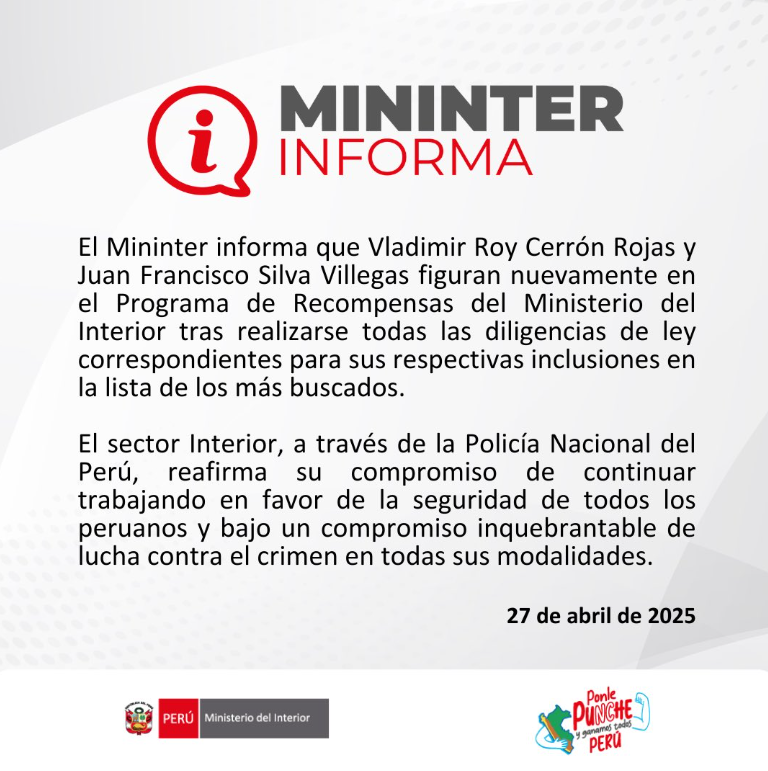 El Ministerio del Interior (Mininter) informó que el líder de Perú Libre, Vladimir Cerrón, y el exministro de Transportes y Comunicaciones, Juan Silva, fueron reincorporados en el Programa de Recompensas de la cartera.