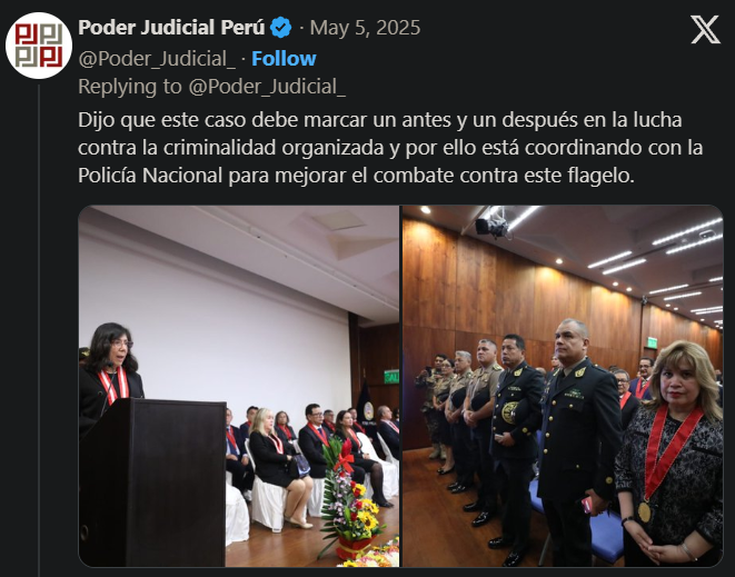 La presidenta del Poder Judicial también resaltó la reciente implementación de la Unidad de Flagrancia en San Juan de Lurigancho como una herramienta clave para combatir la inseguridad ciudadana. Mencionó que se encuentra a la espera de la promulgación de la ley que creará el Sistema Nacional Especializado en Flagrancia, lo que permitirá una mejor articulación entre las instituciones del sistema de justicia.