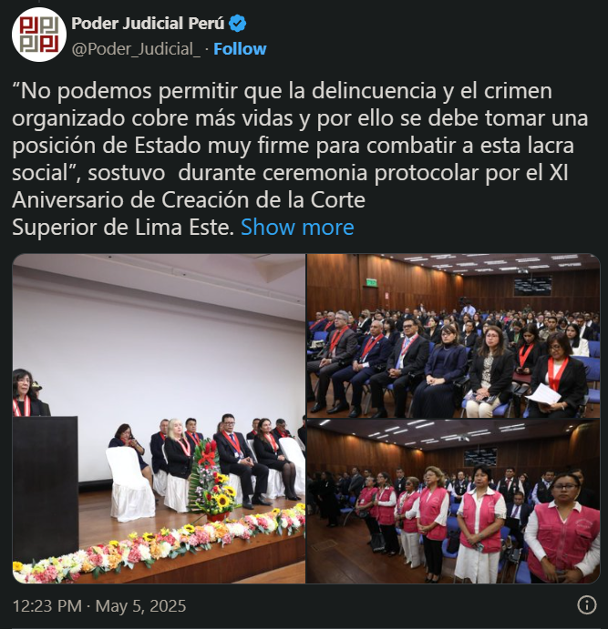 Durante la ceremonia por el 11.° aniversario de la Corte Superior de Justicia de Lima Este, la presidenta del Poder Judicial, Janet Tello Gilardi, hizo un llamado al Estado para enfrentar con determinación al crimen organizado.