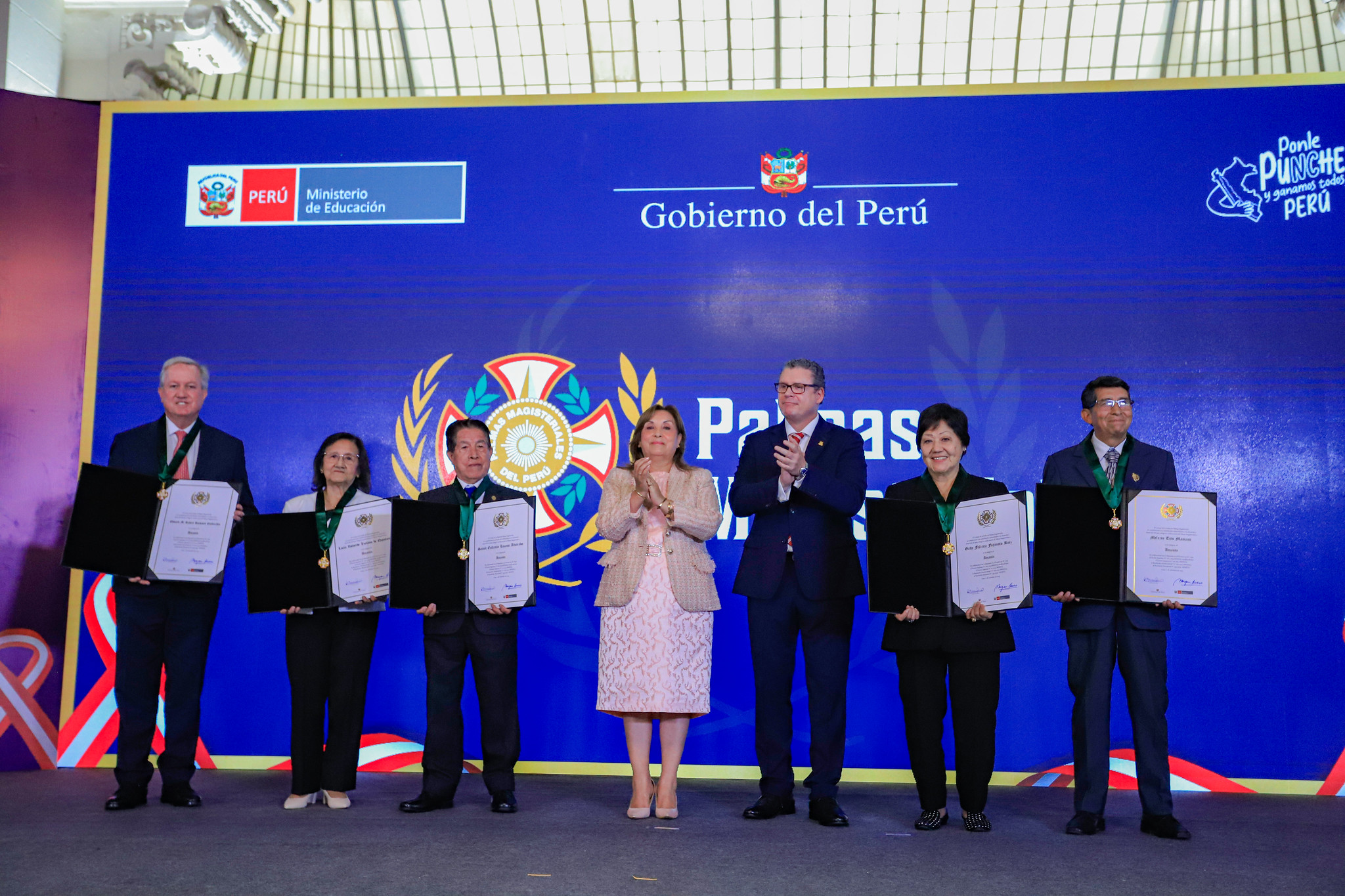 En el marco de la ceremonia, la presidenta lideró la entrega de reconocimientos a once docentes en la categoría Educador. Del mismo modo, fueron distinguidos ocho maestros en la categoría Maestro y, finalmente, en la categoría Amauta se reconoció a cinco personalidades de amplia trayectoria y aporte al país.