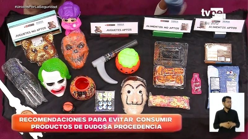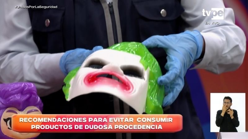 “Antes de adquirir estos productos debemos verificar el empaque, si está debidamente sellado”, explicó la especialista. Mostró ejemplos de máscaras y dulceros con pinturas que se desprenden fácilmente. “Los colores son muy intensos, muy llamativos. Y si lo tocamos, vamos a observar que se desprende la pintura con facilidad”, comentó.